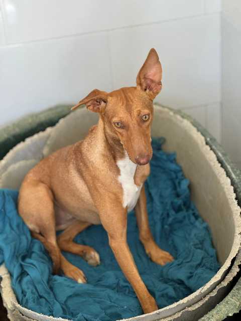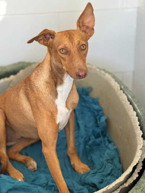Valle ist eine schöne, sensible, Podenca – aufmerksam und freundlich, sobald sie Vertrauen gefasst hat. Unbekannte Situationen und neue Menschen können sie anfangs noch verunsichern, doch bei Bezugspersonen zeigt sie sich zunehmend zugewandt und neugierig.