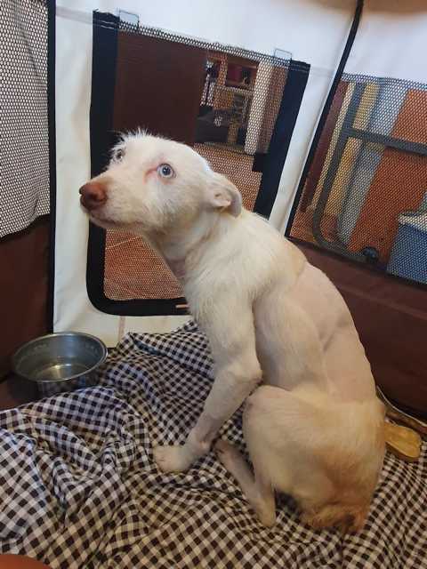 Paloma wurde in einem Gebüsch gefunden – entkräftet, abgemagert und mit gelähmten Hinterläufen. Sie konnte ihre Beine nur noch hinter sich herziehen. Alles deutete darauf hin, dass sie vermutlich einen Autounfall erlitten hatte. Als man sie entdeckte, konnte sie jedoch mit dem Schwanz wedeln – ein kleines Zeichen Hoffnung.