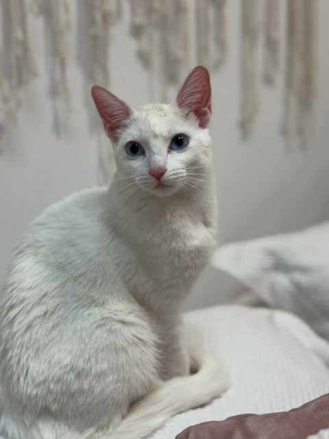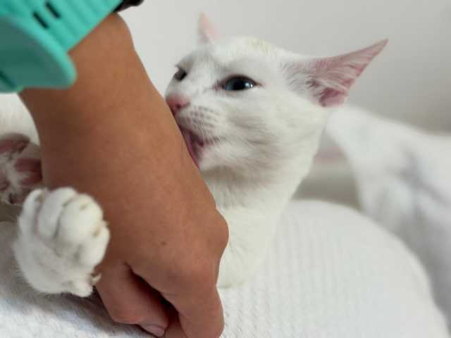 Wir erhielten eine Meldung über eine vermeintliche Hauskatze, die sofort auf den Mann zuging, der sie entdeckte. Zum Glück ließ er sie nicht zurück und informierte uns. So konnten wir sie sichern und in eine Pflegestelle bringen. Anfangs dachten wir, sie sei einfach nur extrem erschöpft, da sie tief und fest schlief. Doch schon bald wurde klar: Dharma ist taub.